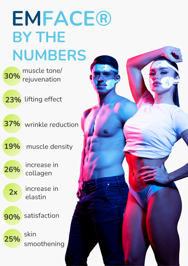 The EMFACE® treatment benefits everyone by targeting visible facial wrinkles, deep skin layers, and muscles. As one ages into the 20s, decreased hyaluronic acid and cell turnover can lead to collagen and elastin reduction, causing aging signs like fine lines, wrinkles, and muscle decline of 3-8% per decade starting from age 30. EMFACE® treatment rejuvenates skin by targeting deep layers and muscles for long-lasting health benefits, making it a preventative measure for glowing and youthful complexion/skin.