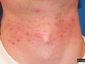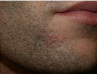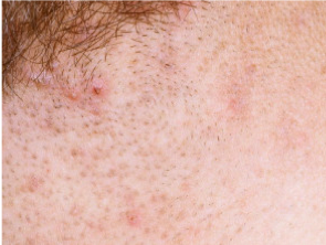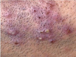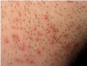- Clusters of small red bumps or white-headed pimples that develop around hair follicles