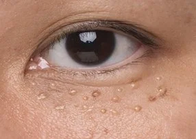 Milia is hard pearl like white tiny bumps that typically appear in a group on the forehead, around the eyes, nose, cheeks and chin.