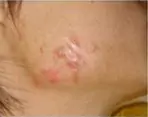A hypertrophic scar is when there is an excessive amount of collagen which appears raised, but not to the same degree as a Keloid scar. Similar to Keloids, they commonly form at the sites of pimples, body piercings, cuts and burns. They often contain nerves and blood vessels.