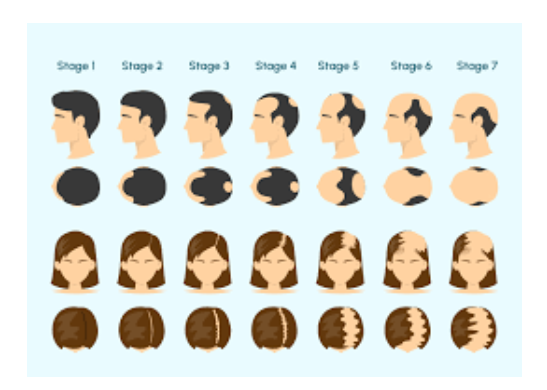 Hair loss clinical grading scale. Stage 1 is considered normal, stage 2 indicates mild. Stages 3, 4 indicate moderate-to-severe hair loss.